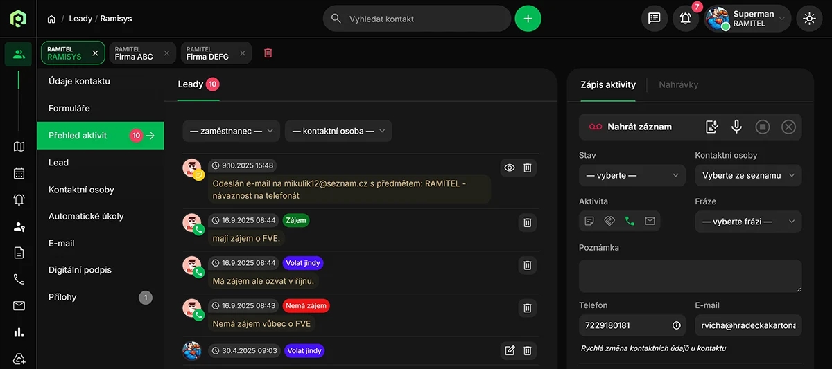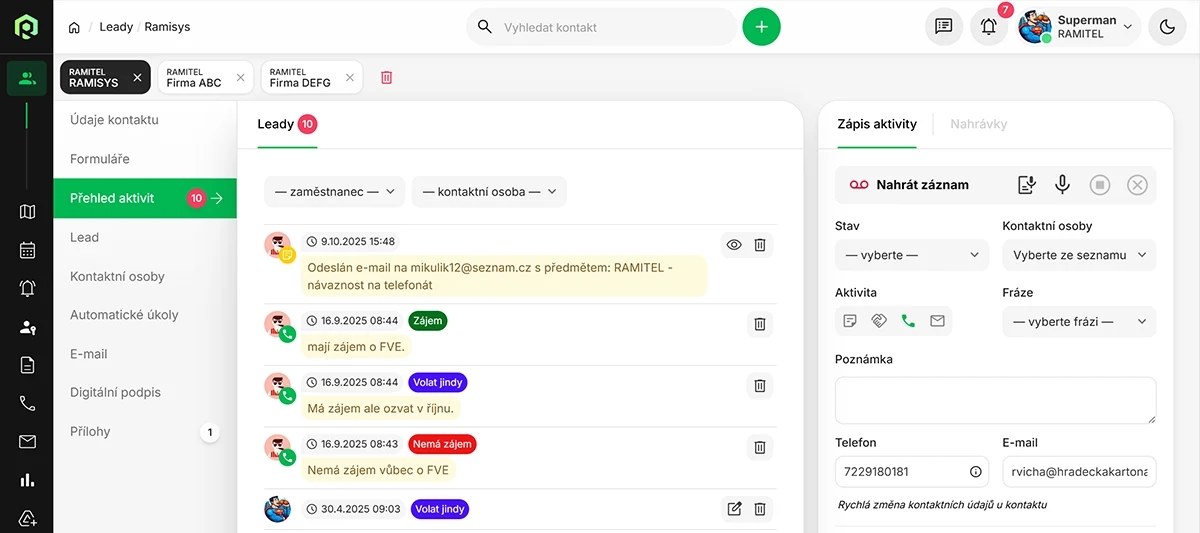 Kombinace CRM a RAMICALL aplikace, díky které budete mít přehled o telefonních aktivitách zaměstnanců.